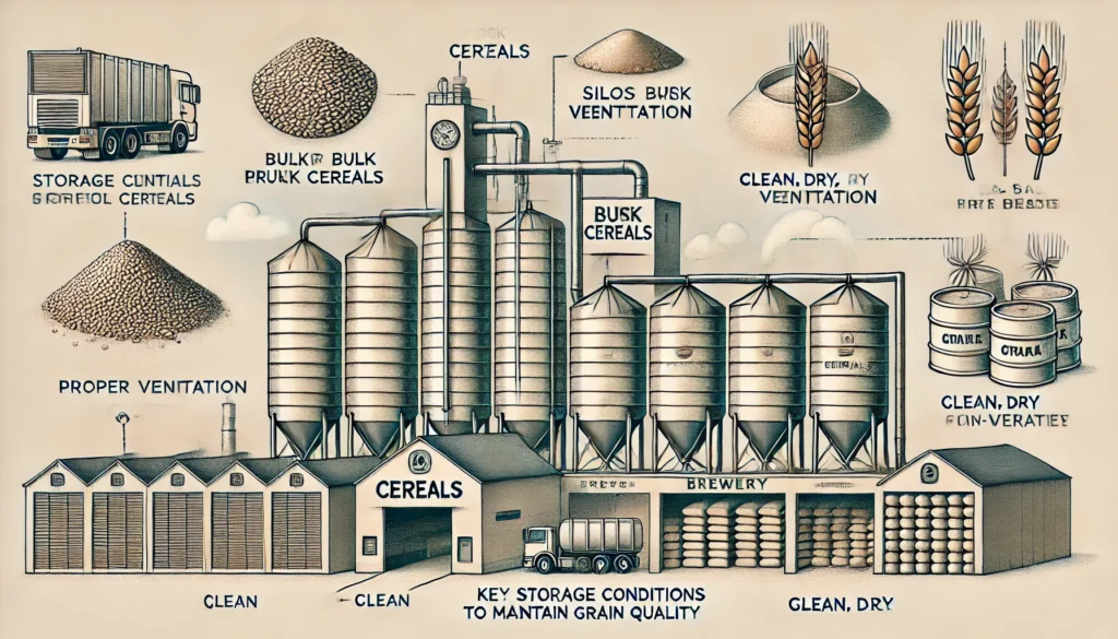 Dentro de la cervecería, los cereales a granel se mueven utilizando tolvas y varios tipos de transportadores como cintas transportadoras, transportadores helicoidales y elevadores de cangilones.