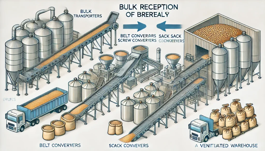 La malta y los adjuntos sólidos pueden ser recepcionados en sacos o a granel. El transporte y manejo dentro de la cervecería son cruciales para mantener la calidad de los cereales y asegurar una operación eficiente e higiénica.